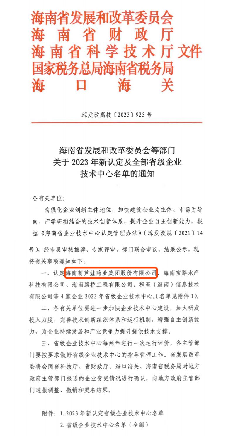 近日,海南省发改委等多部门联合公布了《关于2023年新认定及全部省级企业技术中心名单的通知》,其中,海南z6尊龙时凯药业集团股份有限公司成功通过评审,被认定为省级企业技术中心,是本次获批的4家企业之一。